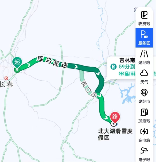 到此处可从长春东收费站驶入珲乌高速公路(G12),途经石头口门、桦皮厂服务区(皆可加油、就餐),从吉林绕城高速公路红旗收费站驶离高速公路,沿永吉方向行驶约15公里即可到达。