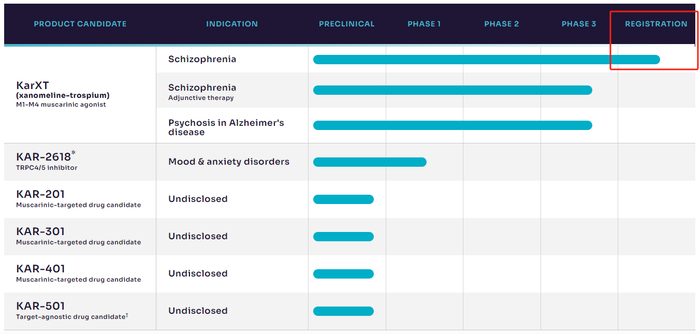 据了解,KarXT是一种口服的、在研的M1/M4首选毒蕈碱激动剂,用于治疗精神和神经系统疾病,包括精神分裂症和阿尔茨海默症中的精神症状。