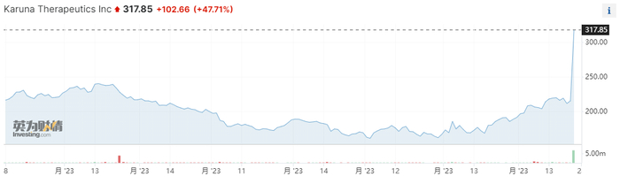 周五(12月22日),在纳斯达克上市的美国生物制药公司Karuna Therapeutics收涨47%,报每股317.85美元,刷新了去年8月份创下的历史高位,市值达到119.9亿美元。