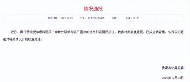 12月23日,贵港市纪委监委发布情况通报:近日,网传贵港爱尔眼科医院“中秋外联明细表”图片的消息引发网民关注,我委对此高度重视,已成立调查组,依规依纪依法对相关情况开展核查处理。