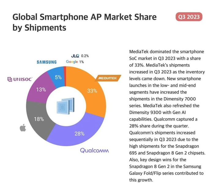 具体按照出货量来说,2023Q3全球智能手机处理器市场份额前五依次是:①联发科 33% ②高通28% ③苹果 18% ④紫光展锐 13% ⑤三星5%。报告中还提到中低端新款手机的陆续推出增加了天玑7000系列的出货量,而高通出货量环比增长离不开骁龙695和骁龙8 Gen2的高出货量。