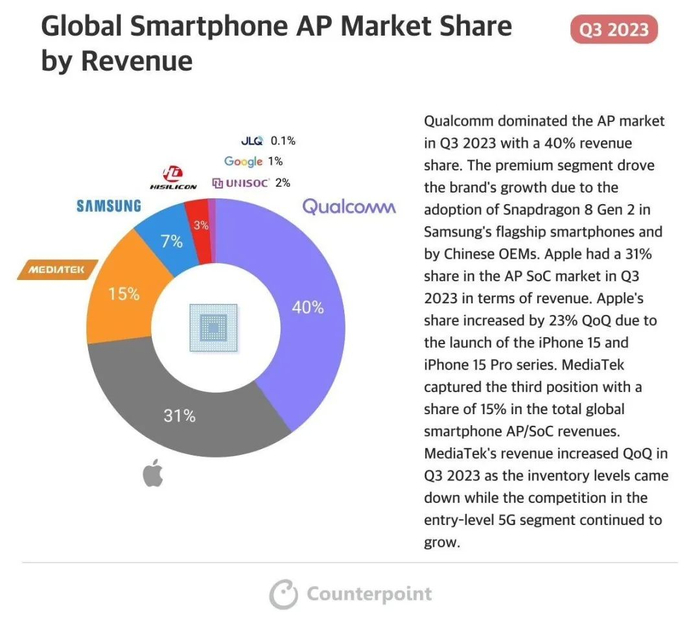 近日市场研究机构Counterpoint Research发布了关于2023年第3季度(7-9月)全球半导体、晶圆代工份额和智能手机应用处理器(AP)份额报告,来看看智能手机SoC都是哪家份额更多~