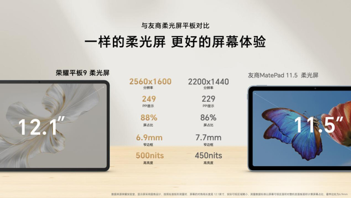 荣耀平板9提供8GB+128GB、8GB+256GB、12GB+256GB、12GB+512GB四种版本,预售优惠价从1499元人民币起,12月29日正式开售。