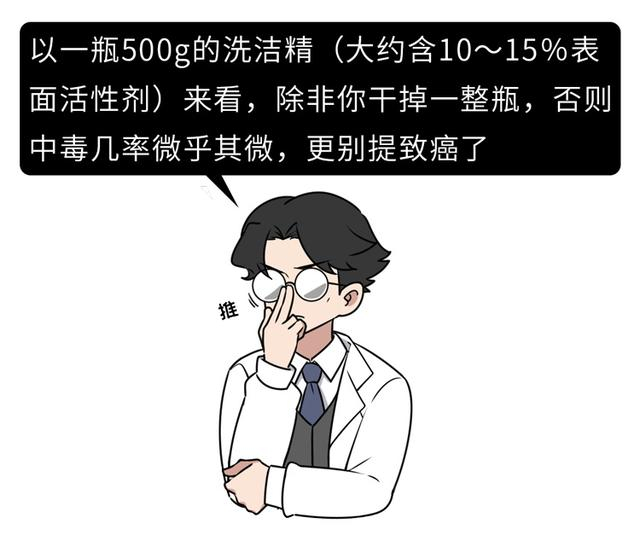 “表面活性剂”就算残留到碗筷中,人体要达到中毒反应,也要直接喝掉1瓶多的洗洁精才可能会出现