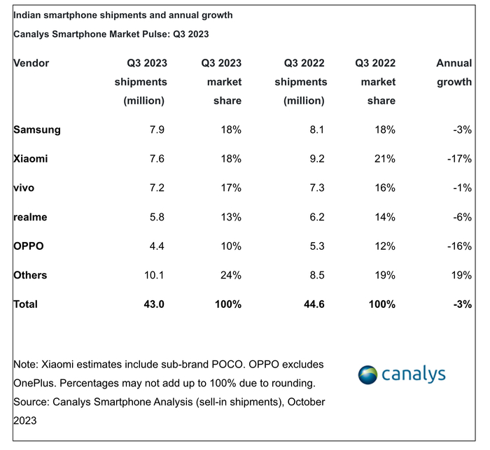 受此影响,根据市场调研机构Canalys发布的2023Q3印度市场数据显示,小米由此前蝉联印度市场销量榜首20个季度,跌至第二位,市场份额年增长率下滑17%。
