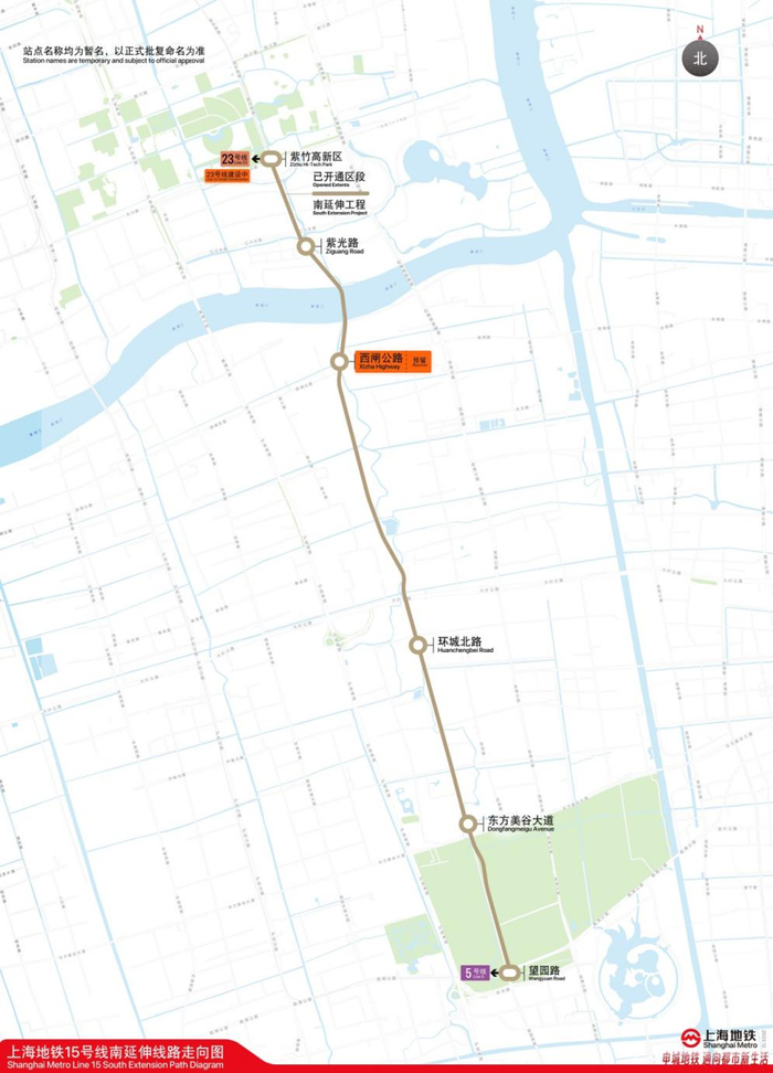 15号线南延伸工程途经奉贤区和闵行区,线路南起奉贤区望园路站,沿望园路、莲花南路走行,北止于已运营的15号线紫竹高新区站,分别设紫光路站、环城北路站、东方美谷大道站等4座车站及西闸公路预留站1座,其中望园路站与5号线换乘。线路全长10.26公里,采用全地下线敷设方式。
