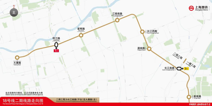 18号线二期自18号线长江南路站北端头井(不含)至大康路站,线路长约8.01公里,设车站6座,目前已全面进入车站主体土建施工阶段。
