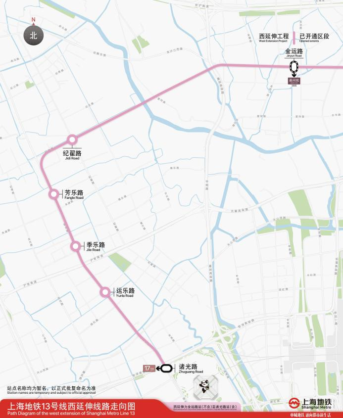 13号线西延伸自13号线金运路站(不含)向西延伸,设车站5座。线路全长约9.65公里,已开工3座车站。