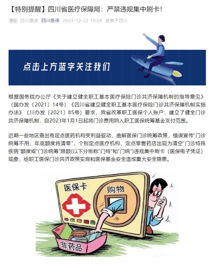 “四川医保”微信公众号12月22日发布特别提醒称:近期一些地区查出有定点医药机构受利益驱动,曲解医保门诊统筹政策,错误宣传“门诊统筹不用,年底额度将清零”,个别定点医疗机构、定点零售药店出现为清空“门诊特殊疾病”额度或“门诊统筹”限额违规集中刷卡(医保电子凭证)现象,给职工医保门诊共济政策实施和医保基金安全造成重大安全隐患。