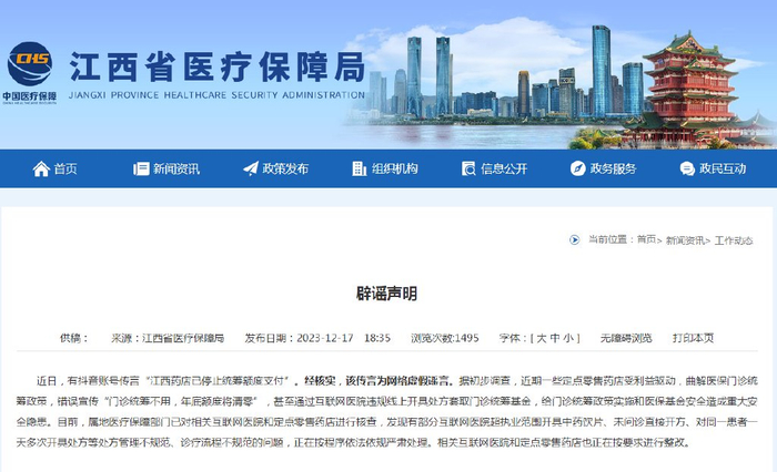 据江西省医疗保障局消息,近日,有抖音账号传言“江西药店已停止统筹额度支付”。经核实,该传言为网络虚假谣言。