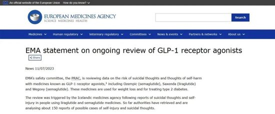 2023年7月11日,欧洲药品管理局(EMA)官网公告称,目前收到150个关于此类药物的自残自杀病例报告,将对诺和诺德公司旗下司美格鲁肽等三款产品展开调查。