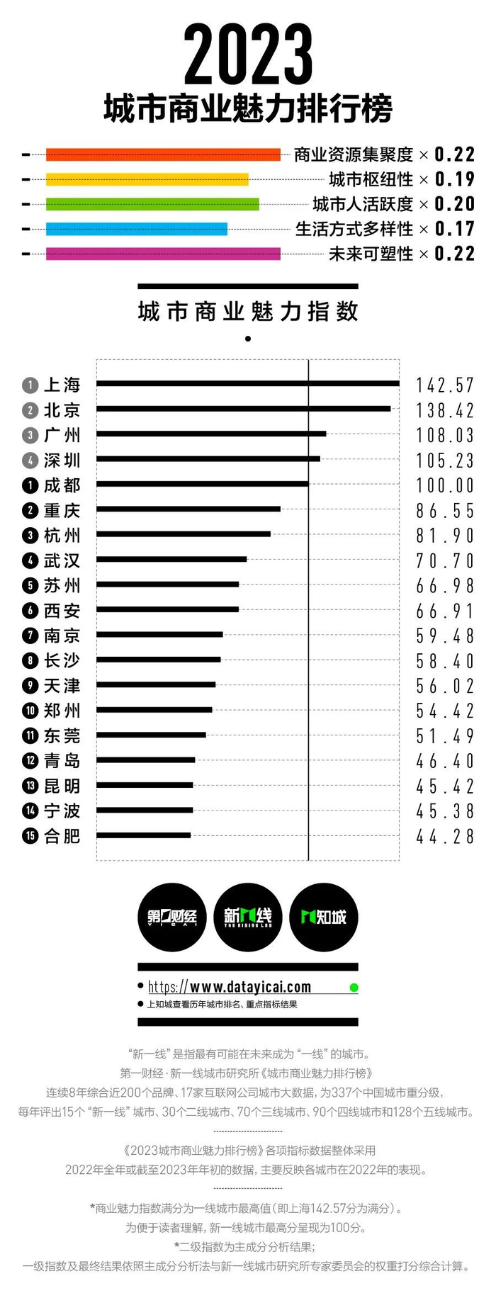 通过近200个品牌、17家互联网公司和数据机构的城市大数据,围绕商业资源集聚度、城市枢纽性、城市人活跃度、生活方式多样性和未来可塑性五大一级维度来评估337座地级及以上城市。
