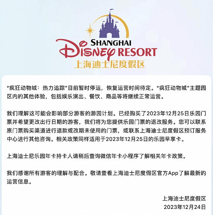 12月24日,上海迪士尼度假区在其官微发布通知:“疯狂动物城:热力追踪”目前暂时停运,恢复运营时间待定。“疯狂动物城”主题园区内的其他体验,包括娱乐演出、餐饮、商品等将继续正常运营。已经购买了12月25日乐园门票并希望更改出行日期的游客,上海迪士尼将提供乐园门票的退改服务。
