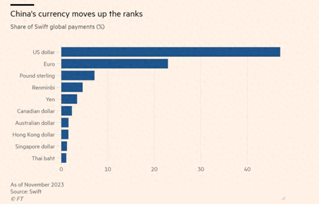 当月,人民币在国际支付中的份额占比升至第四,超过日元。这是人民币国际支付全球排名近2年来首次超越日元,成为排在美元、欧元和英镑之后的全球第四大常用货币。人民币上一次排在第四位是在2022年1月。