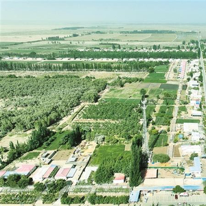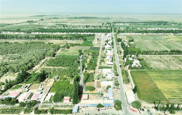 十四师昆玉市二二五团玉泉镇拉依苏村航拍图(资料图片)。近年来,二二五团依托“世界长寿村”的影响力和315国道网红公路的游客吸附力,大力发展文旅康养产业,走出了一条经济发展和生态环境保护互融共生的新路。 江宇 摄