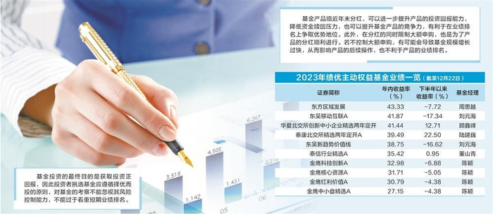 例如,12月22日,暂居普通股票型基金业绩排名首位的金鹰科技创新发布分红公告称,将于12月27日分红,A/C份额分红方案均为0.67元/10份基金份额。这是该基金2023年的第五次分红,而第四次分红就发生在约半个月前的12月8日。此外,12月1日,金鹰基金公告称,自12月4日起暂停旗下金鹰科技创新、金鹰核心资源两只基金10万元以上的大额申购。上述两只基金均由基金经理陈颖掌舵,为年内绩优基金。