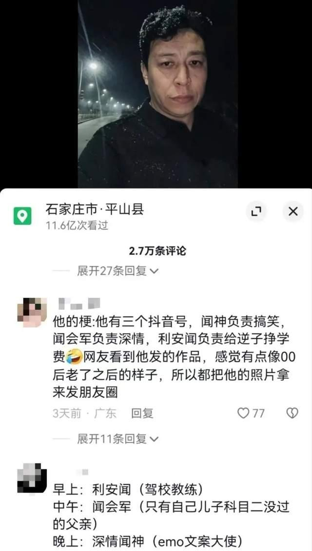 有网友总结,这3个账号就像三个独立的人格,早上,他是“带九个学员,过了八个,自己儿子没过”的驾校教练;中午,他是跳着土味舞蹈的“闻神”;晚上,他是发着emo文案配自拍的深情闻会军。
