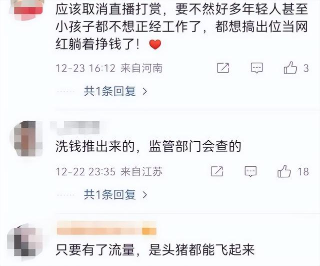 对于这种情况,不少人认为,搞个直播就能获取普通人一辈子都赚不到的巨额财富,这种现象具有很不好的导向。“现在很多年轻人和孩子都不想正经工作了,都想搞出位当网红躺着挣钱”“有了流量,是头猪都能飞起来”,甚至有人怀疑“这就是在洗钱”。