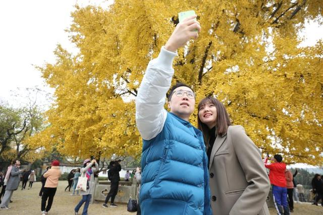 2020年12月10日,市民游客不舍远近汇聚于嘉定古树公园,争相目睹上海1200年银杏“树王”风采。