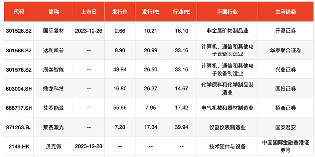在上市方面,Wind数据显示,截至12月24日,A股共有6家企业已在网上发行股份,融资金额为57.72亿元,目前,仅创业板1家企业公布挂牌计划。上周,A股共计6家企业挂牌上市,融资总额共计34.214亿元。