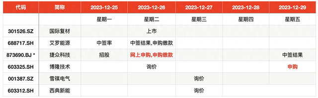 本周新股数量相对较少,但依旧具有看点。澎湃新闻根据Wind及公开信息梳理统计,本周(12月25日-12月29日)共有2只A股新股网上申购,比上周(12月18日-12月22日)减少了3只。其中,浙江捷众科技股份有限公司(简称“捷众科技”,873690.BJ)是上汽通用的一级供应商,而上海博隆装备技术股份有限公司(简称“博隆技术”,603325.SH)打破大型聚烯烃气力输送系统的海外垄断,实现了大型聚烯烃气力输送系统的进口替代。