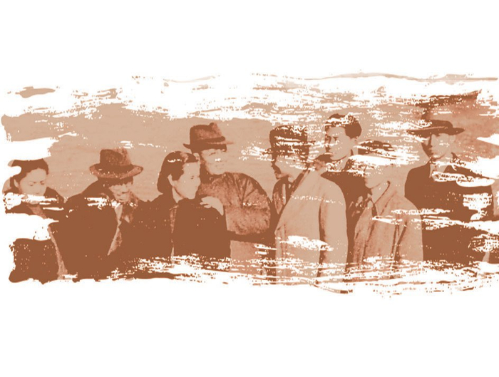 1946年12月5日茅盾(左二)、孔德沚(左一)夫妇赴苏联访问,臧克家(右一)与郭沫若(左四)、于立群(左三)、任钧(左五)、范泉(右二)等到上海码头送别