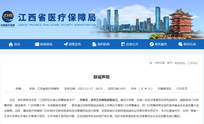 近日,有抖音账号传言“江西药店已停止统筹额度支付”。经核实,该传言为网络虚假谣言。据初步调查,近期一些定点零售药店受利益驱动,曲解医保门诊统筹政策,错误宣传“门诊统筹不用,年底额度将清零”,甚至通过互联网医院违规线上开具处方套取门诊统筹基金,给门诊统筹政策实施和医保基金安全造成重大安全隐患。目前,属地医疗保障部门已对相关互联网医院和定点零售药店进行核查,发现有部分互联网医院超执业范围开具中药饮片、未问诊直接开方、对同一患者一天多次开具处方等处方管理不规范、诊疗流程不规范的问题,正在按程序依法依规严肃处理。相关互联网医院和定点零售药店也正在按要求进行整改。