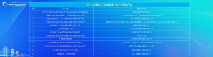 高吸收性生物质纤维敷料成型关键技术等11个项目获得“中国十大纺织科技·新锐科技奖”;防护用闪蒸法聚乙烯非织造布的产业化及其在核工业领域的应用等13个项目获得“中国十大纺织科技·产业推动奖”;纺织面辅料超临界CO2无水染色技术等13个项目获得“中国十大纺织科技·绿色先锋奖”。