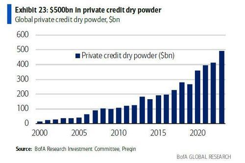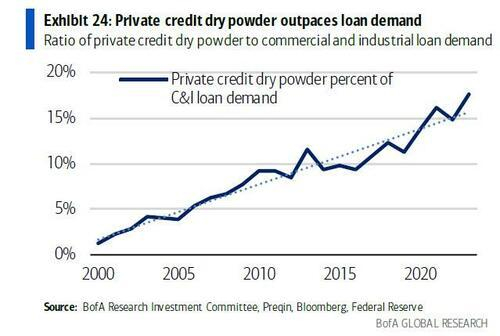 美银数据显示,2023年,全球私人信贷市场的现金储备达到了近5000亿美元,比2013年增长了170%。相比之下,目前商业和工业贷款需求总额为2.8万亿美元。