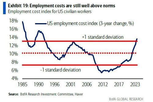 工资方面,衡量总薪酬的就业成本指数 (ECI) 自 2020 年以来上涨了13.5%,为1992年以来的最大增速。