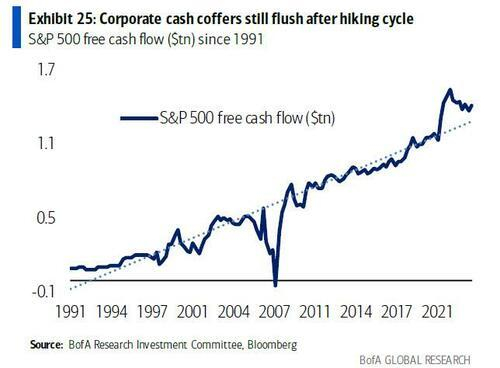 得益于强劲的私人信贷市场,标普500成分公司的自由现金流量尚未回落至疫情前的趋势。当前标普500自由现金流量为1.4万亿美元,比历史趋势预期高出1000亿美元。