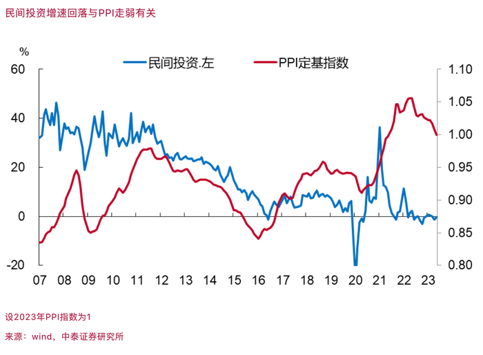 民间投资不振有多重原因,如产能过剩、杠杆率过高、融资成本高等。为此,2015年开始推进供给侧结构性改革,并取得了显著成效。但疫情之后,民间投资并没有如期反弹,与此对应的是PPI从2022年10月开始持续负增长。