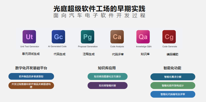 自2021年,光庭信息首创提出“超级软件工场”,探索通过数字化、知识化、智能化、自动化,打造“超脑”,实现人机协同的智能化软件开发新模式。经过两年的研究与开发实践,光庭信息联合多家学术机构共同编制发布《超级软件工场白皮书》,并基于AI大模型进一步规划建设五大产品体系,覆盖汽车软件研发和管理全过程。