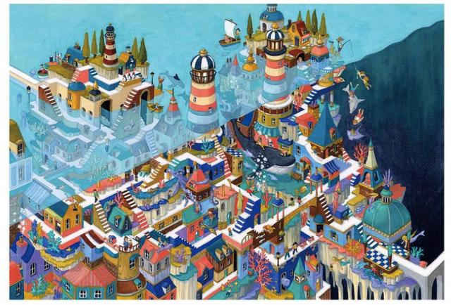 朱奈达的构想很快有了实体,也就是他的第一本绘本《路》。这本绘本没有文字,男孩从左端出发,女孩从右端启程,翻过一页又一页主题不同、道路近似迷宫的城市……看起来像迷宫游戏书,仔细读却发现它也不算迷宫,不管你怎么走,总能通过这座城市,走去下一个城市。而每一条街道角落里,有许多活生生的,似乎怀揣着自己故事的居民。