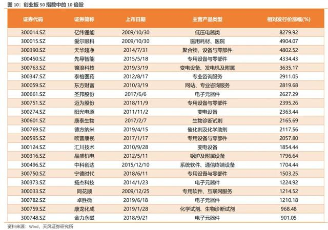 在创业板1300多家公司中,曾诞生了近50家10倍牛股。其中,22家属于创业板50指数的成分股,在总成分股中占比44%(来源:Wind、天风证券研究所,截至2022.9.30)。