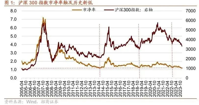 经过2021-2023年连续3年的持续调整,沪深300指数估值持续下移。截至12月22日,沪深300指数最新市净率(PB)达到1.17倍,为历史最低水平。