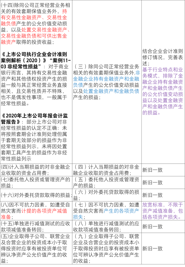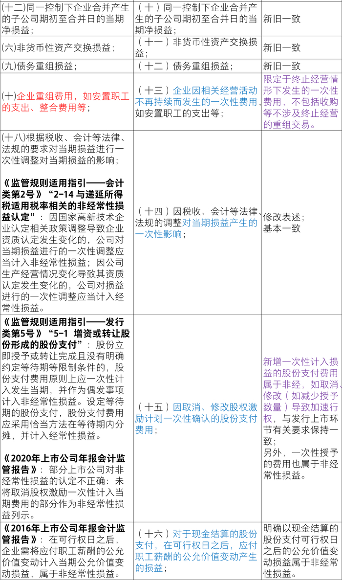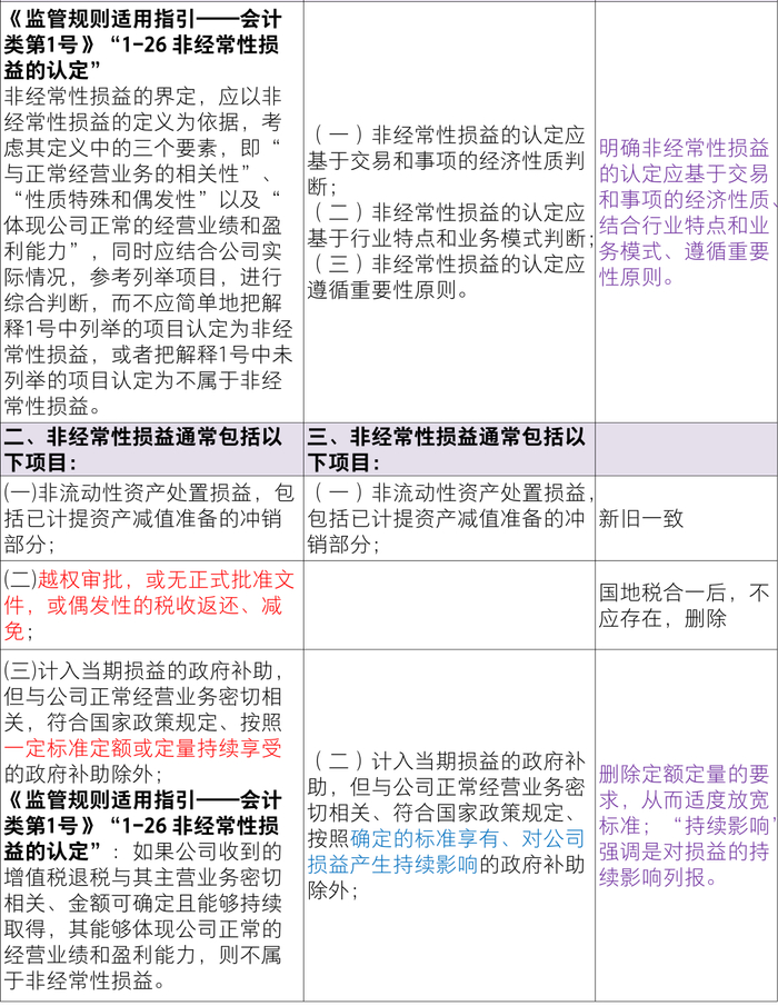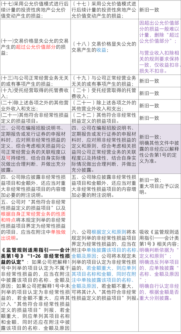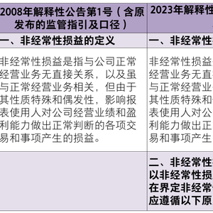 具体来讲修订内容包括:(1)对于计入当期损益的政府补助,新规则删除定额定量的要求,从而适度放宽标准,明确“持续影响”强调是对损益的持续影响;(2)对于因不可抗力因素导致的损失,新规则放宽标准,不限于资产减值准备,包括各项资产损失;(3)对于企业重组费用,新规则限定于终止经营情形下发生的一次性费用,不包括收购等不涉及终止经营的重组交易;(4)新规则新增一次性计入损益的股份支付费用属于非经(取消、修改导致加速行权),与发行上市环节有关要求保持一致;另外,一次性授予的股份支付费用也属于非经常性损益;明确以现金结算的股份支付可行权日之后的公允价值变动损益属于非经常性损益;(5)对于交易价格显失公允的交易,删除“超过公允价值部分”,包括全部收益,且仅收益扣非、损失不扣非;明确判断依据为“定义和原则”;(6)违反列举项目的,应单独披露“名称、金额及原因”,自行认定非经的,根据金额是否重大分别披露;(7)与编报规则第15号一致,新增保密要求。
