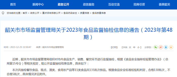 韶关市市场监督管理局关于2023年食品监督抽检信息的通告(2023年第48期)