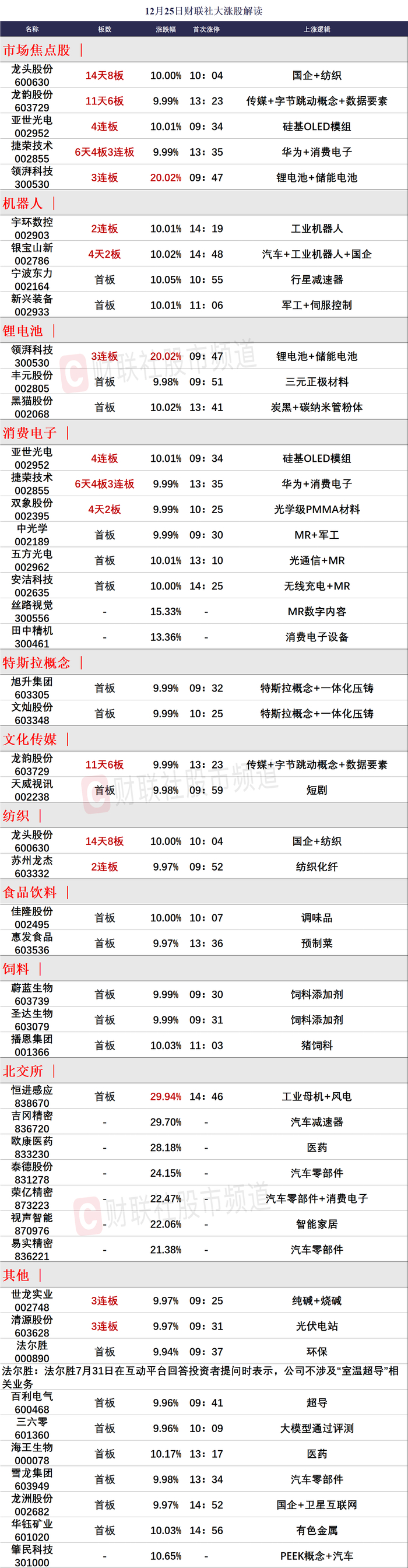 财联社12月25日讯,今日34股涨停,12股炸板,封板率为74%,亚世光电4连板,领湃科技20CM3连板,清源股份、世龙实业3连板,宇环数控、苏州龙杰2连板,龙头股份8天6板,银宝山新18天6板,捷荣技术6天4板,龙韵股份3天2板,双象股份4天2板,法尔胜5天2板,*ST越博20CM首板,北交所恒进感应30CM首板。盘面上,两市超3100家个股下跌;板块方面,MR、一体化压铸、工业母机、军工等板块涨幅居前,短剧游戏、拼多多、供销社、贸易等板块跌幅居前。