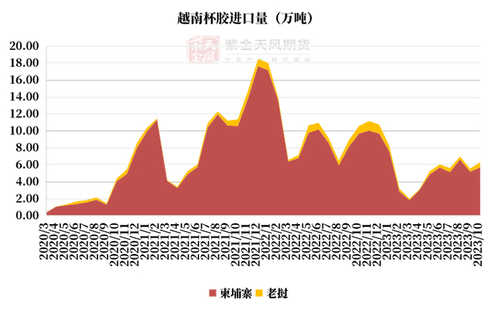 越南海关数据显示,越南1-10月累计杯胶进口量为44.2万吨,同比减少48.82%。