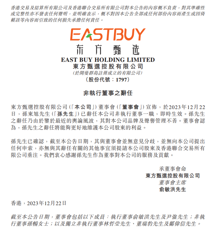 12月22日晚间,东方甄选在港交所公告,公司董事会宣布,孙东旭已辞任公司非执行董事一职,即时生效。其辞任相关职务,主要是因为在最近的舆论风波中,对公司品牌及声誉管理不善。