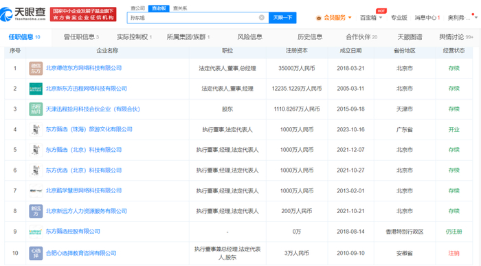 同时,孙东旭在10家公司担任董监高等职务,大都是新东方教育集团的关联公司。