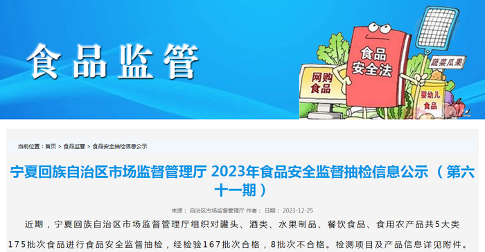 近期,宁夏回族自治区市场监督管理厅组织对罐头、酒类、水果制品、餐饮食品、食用农产品共5大类175批次食品进行食品安全监督抽检,经检验167批次合格,8批次不合格。检测项目及产品信息详见附件。
