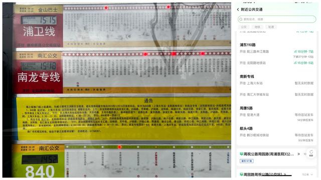 在换乘站的公交站台上,已贴出线路调整的通告(左)。之前查找附近公交时,“随申行”界面仍显示原线路的名字,而非新的线路,同时没有实时数据(右)。王昀 图