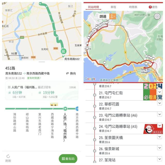 “随申行”界面上,公交站名竖写横列,能显示的站名有限,横向划屏也相对别扭(左);而香港九巴官方的应用,站名横写竖列,相应界面比较友好(右)。左右为同一台手机的截图。