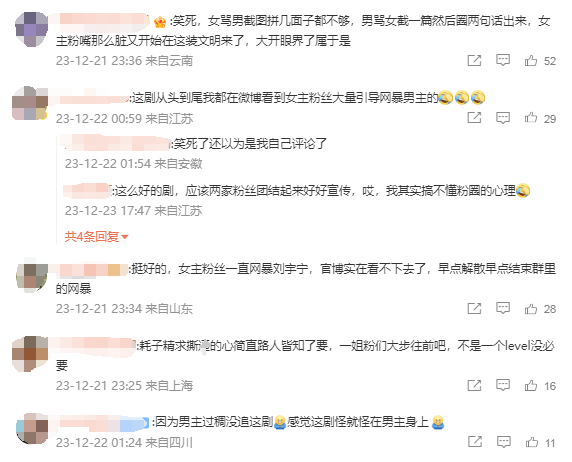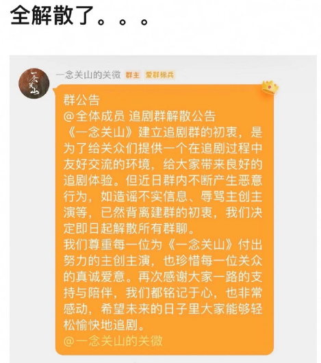 因为双方的恶意不断扩大,日前该剧的官方追剧群全部宣告解散,群公告中称“建立追剧群的初衷是为了提供一个友好交流的环境,但近日群内不断产生恶意行为,如造谣不实信息,辱骂主创主演等,已然背离建群的初衷,我们决定即日起解散所有群聊。”令人遗憾的是,在这条信息的相关微博评论区,粉丝们的相互攻讦也没有停止。
