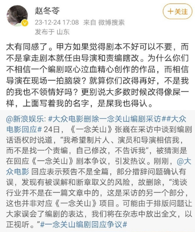 且不说张巍在采访中谈及的编剧话语权说的到底是不是《一念关山》这个项目,但这番话确确实实引起了相当多业内编剧的共鸣和支持。《警察荣誉》编剧赵冬苓、《猎罪图鉴》编剧贾东岩 、导演高群书、编剧柳桦、编剧崔健、《芈月传》作者蒋胜男均转发微博支持张巍。赵冬苓直言“甲方如果觉得剧本不好可以不要,而不是拿走剧本就任由导演和责编瞎改……就算你们改得再好,不是我的我也不领情好吗?”张巍和一众编剧们的发声支持也切中了确实存在的问题,编剧话语权不足,被魔改剧情狠狠伤到的观众转过来骂编剧在胡编乱造,殊不知这剧情已经不知道倒了多少手了,最终的呈现编剧也无能为力。