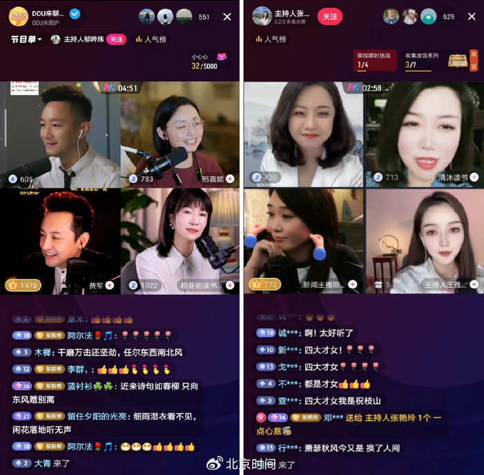 在11月15日晚的“四人飞花令”专场中,@邢嘉妮 @主持人邬晔纬 @费军 @和菲姐读书吧 四位朗诵主播围绕“风”“雪”等与冬日有关的字展开了古诗词接龙PK;随后登场的@清沐读书 @新闻主播丽姐 @主持人王雅婷 @主持人张艳玲 四位女性主播,则创新了传统飞花令的形式,每人认领“春花秋月”四个字中的一个,并围绕其展开接龙。