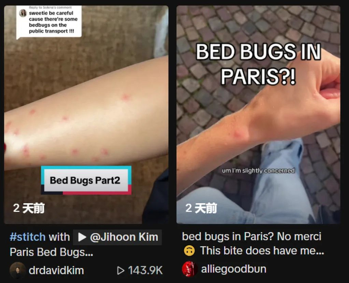 乘客们害怕沾上臭虫,大家都默认站着搭地铁和火车。一些参加了巴黎时装周的KOL和博主也自称被臭虫攻击和叮咬。臭虫肆虐酒店的床单、被罩,Airbnb短租屋也有它们张狂横行的身影,甚至餐馆也不能幸免。社交平台上很容易就能搜到法国人上传的图片和视频。