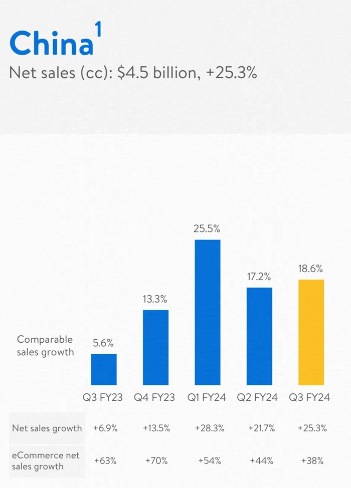 快速增长背后,中国市场功不可没。据悉,在其他市场整体增速放缓情况下,沃尔玛中国第三季度净销售额为45亿美元,同比增长25.3%,可比销售额增长18.6%,电商业务净销售额增长38%,且从2022第四季度开始,每季度均保持两位数增长态势。